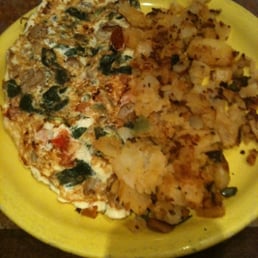 Spinach, tomatoes, mushrooms and feta cheese. Served with potatoes and toast.